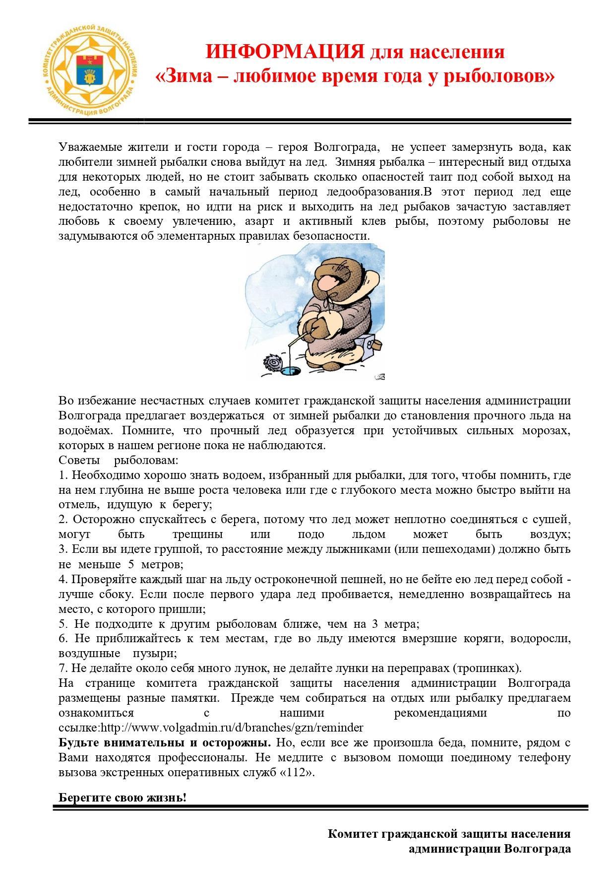 Уважаемые жители и гости города – героя Волгограда, не успеет замерзнуть вода, как любители зимней рыбалки снова выйдут на лед. Зимняя рыбалка – интересный вид отдыха для некоторых людей, но не стоит забывать сколько опасностей таит под собой выход на лед, особенно в самый начальный период ледообразования.В этот период лед еще недостаточно крепок, но идти на риск и выходить на лед рыбаков зачастую заставляет любовь к своему увлечению, азарт и активный клев рыбы, поэтому рыболовы не задумываются об элементарных правилах безопасности.