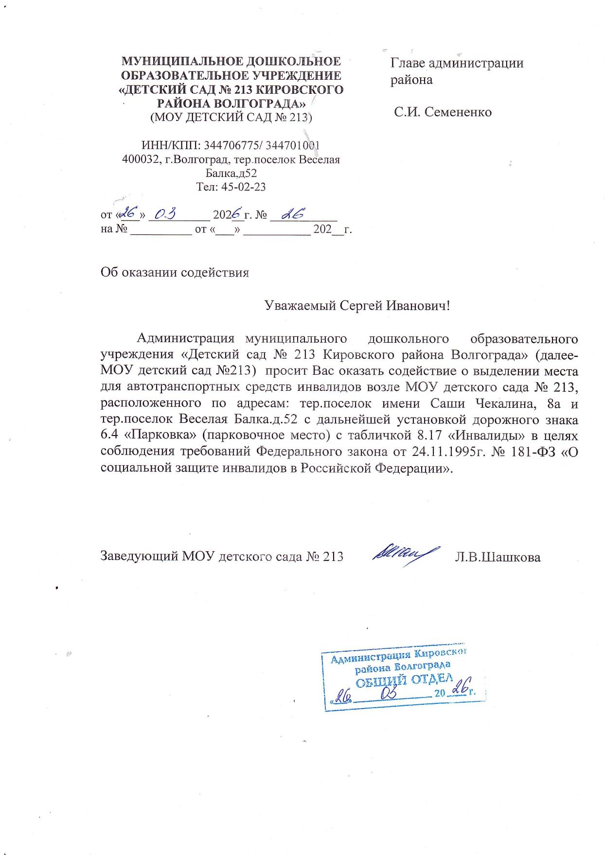 МОУ детский сад №213 подал заявку об оказании содействия в установке дорожного знака 6.4 "Парковка" (парковочное место) с табличкой 8.17 "Инвалиды"